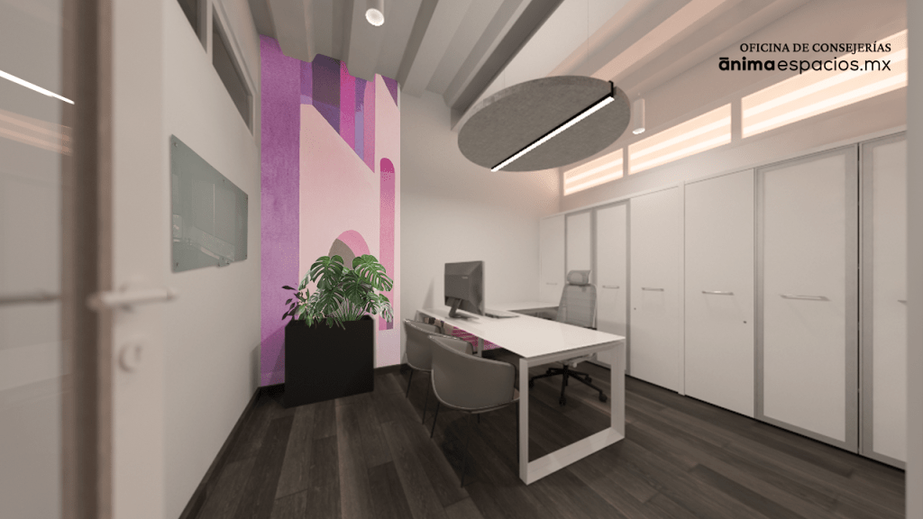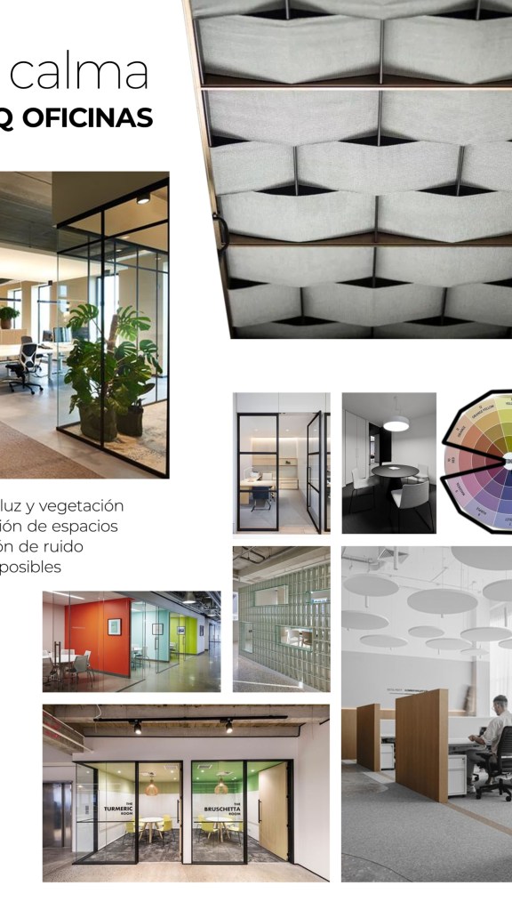 Creamos soluciones para reducir el ruido, natural en un conjunto de oficinas, e intervenciones puntuales de arte que dieran inspiración hacia un ideal común. Con un piso oscuro se genera poco contraste con elementos distractores y se lleva la mirada arriba, donde hay tonos claros y tantas plantas como nos permitieron, como siempre.